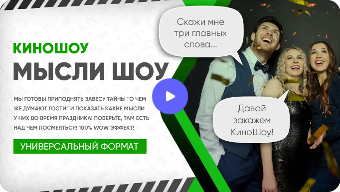 И уже через 2-3 часа после начала торжества вы увидите готовый ролик, в котором гости праздника предстанут в образе звезд популярных фильмов, попадут в объектив юмористической "скрытой камеры" или расскажут о событии в самом смешном интервью!